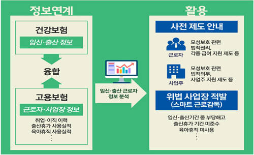 고용노동부는 임신·출산 기간 중인 근로자를 부당해고하거나 출산휴가를 부여하지 않는 관행을 막기 위해 건강보험의 임신·출산 정보를 제공받아 임신근로자와 사업장에 모성보호 제도를 미리 안내하고 사업장을 지도·점검할 계획이다.