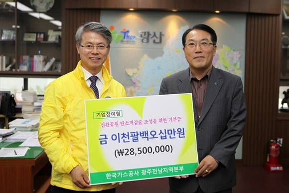 [프라임경제] 한국가스공사 광주전남지역본부(본부장 황호선)가 8일 '신완·솔무공원 탄소저감 숲 조성사업'에 써달라며 2850만원을 광주 광산구에 전달했다.