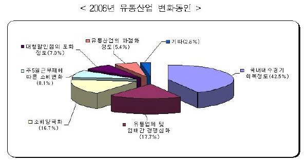 이러한 유통산업의 성장에 큰 영향을 미치는 요인으로 응답자들은 국내 내수경기의 회복정도(42.5%), 유통업체 업태간 경쟁심화(17.7%), 소비양극화(16.7%), 주5일 근무제에 따른 소비변화(8.1%) 등을 꼽았다.