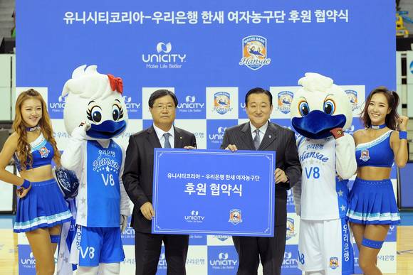 국내 여자농구 최정상의 우리은행 한새여자프로농구단의 홈경기 중 진행된 이날 행사에는 유니시티코리아 영업&마케팅 총괄 조경규 상무, 우리은행 한새여자프로농구단 유점승 前단장, 위성우 감독 등이 참석해 후원물품 협약을 체결했다.