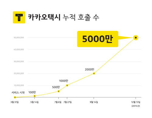 지난 3월31일 서비스를 시작한 카카오택시는 출시 한 달 반만에 누적 호출 수 100만건을 기록하며 성장세를 달려왔다. 약 8개월간 누적된 카카오택시 호출 수는 5000만건을 넘어섰고, 하루 호출 수는 60만건에 달한다. 기사 회원 수는 전국 택시 면허 수의 70%를 육박하는 19만명 이상으로 나타났다.