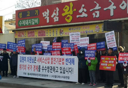 [프라임경제] 보수 성향의 일부 시민단체들이 4일 오후 국회 기획재정위원회 김현미 의원(새정치민주연합)의 지역구인 경기 고양시 일산 서구 일대에서 서비스산업 발전 기본법안 입법을 촉구하는 피켓 시위를 벌였다.