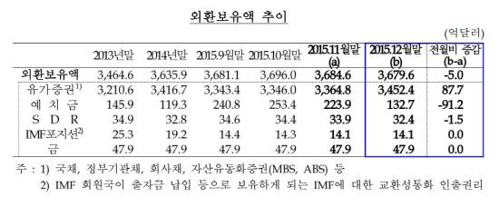 한국은행이 5일 발표한 '2015년 12월말 외환보유액'에 따르면 지난달 현재 우리나라의 외환 보유액은 3679억6000만달러로 전월 말 3684억6000만달러보다 5억달러 줄었다.