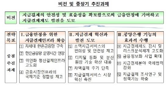 주요 추진과제로는 우선 한은금융망(BOK-Wire)의 안전성과 참가 금융기관(130개)의 이용 편의성을 높이고 국외 인프라와의 연계 기반 확보 등을 위해 차세대 한은금융망을 전면 재구축한다.