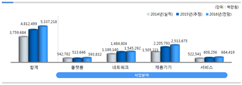 그러나 매출의 경우 제품기기 분야가 네트워크 분야보다 웃돈 수치를 나타냈다. 제품기기 분야의 매출액은 2조2058억원으로 가장 많았고, 1조4848억원의 네트워크 분야 매출액이 뒤를 따랐다.