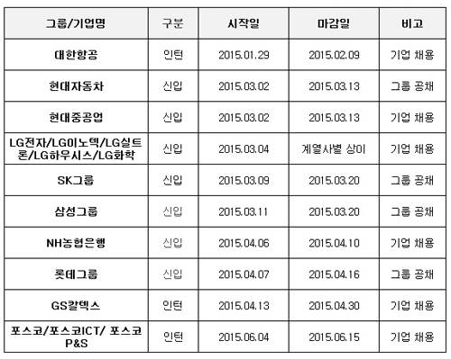 이어 △대한항공 1월29일~2월9일 △NH농협은행 4월6~10일 △롯데그룹 4월7~16일 △GS칼텍스 4월13~30일 △포스코·포스코ICT·포스코P&S 6월4~15일 각각 채용을 실시한 것으로 조사됐다.