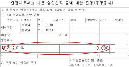 포스코는 앞서 지난해 10월 2015년 3분기 6582억원의 순손실을 기록했으며 연결기준으로 3000억원의 당기순손실이 예상된다고 공시한 바 있다. 표면적으로는 철강제품 가격 하락과 원화약세 같은 영업외적 요인으로 보인다.