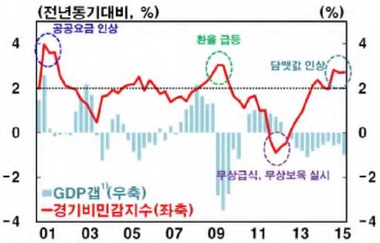 구체적으로 경기비민감지수 가운데 공업제품의 경우 △글로벌 경쟁 △수입물가 영향 △담뱃값 인상 등으로 경기 흐름과의 관계가 약화됐다.