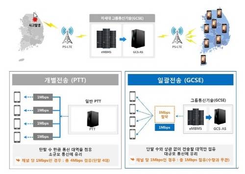 그룹통신기술은 하나의 채널로 일대다 방식의 실시간 통화가 가능한 구조다. 즉 최소한의 망 자원으로도 대규모 그룹통신이 가능하다. 기존 LTE 방식은 재난현장에 수백 명이 몰릴 경우 원활한 통신이 어려웠다.