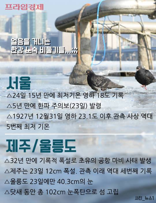 서울은 지난 24일 최저기온 영하 18도를 기록해 2001년 1월15일 영하 18.6도 이후 가장 낮았습니다. 하루 전인 23일에는 5년 만에 한파경보가 발령되기도 했죠. 1927년에 관측된 역대 최저 기온인 영하 23.1도에는 못 미치지만 체계적인 기록 관리가 이뤄진 것이 1950년 이후라는 점을 감안하면 역대 5위의 기록입니다.