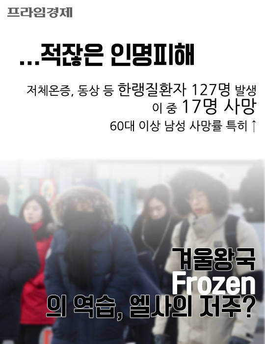 인명피해도 상당했습니다. 올겨울 추위 탓에 총 17명이 숨졌고 저체온증, 동상 등 한랭질환자도 127명이나 발생했는데요. 특히 60대 이상 남성의 피해가 컸습니다.