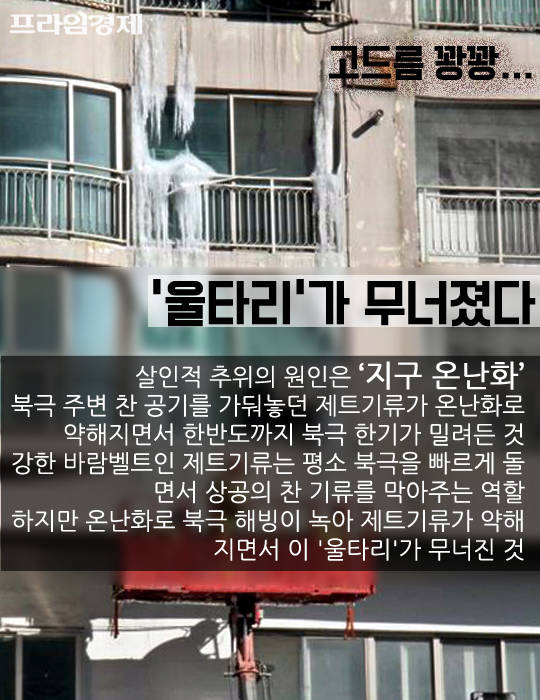 내용을 들여다보면 북극 주변 찬 공기를 가둬놓던 제트기류가 온난화로 약해지면서 북극 한기가 한반도에까지 영향을 끼쳤다는군요. 제트기류는 강한 바람대로 평소 북극주변을 빠르게 돌면서 북극 상공의 찬 기류를 막아주는데 온난화로 북극 해빙이 녹아 이것이 약해지면서 이른바 '한파 울타리'가 무너진 셈이죠.