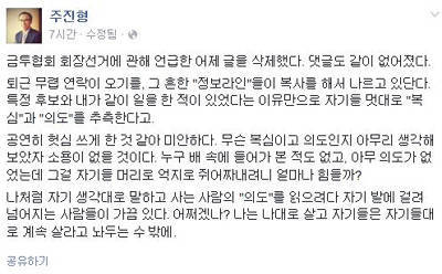 주 사장은 또 "무슨 복심이고 의도인지 아무리 생각해보았자 소용없을 것"이라며 "나처럼 자기 생각대로 말하고 사는 사람의 '의도'를 읽으려다 자기 발에 걸려 넘어지는 사람들이 가끔 있다"고 일갈하기도 했다.