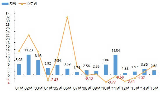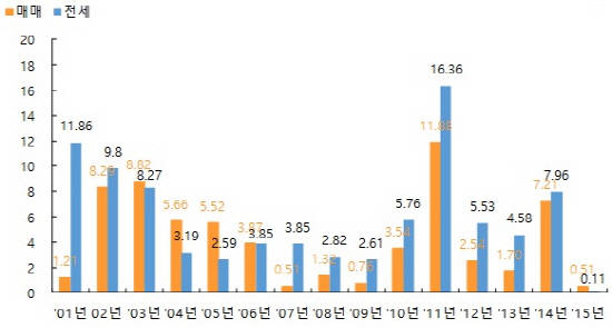 다만, 충북과 경북처럼 매매가와 전세가격이 지속 상승했다고 해도 누적상승률이 높았던 것은 아니다. 2001년부터 2015년까지 충북 매매가와 전세가격 상승률은 각각 130.55%·165.33%, 경북은 매매 114.20%·전세 162.56%다. 반면, 전국 평균 상승률은 각각 148.46%·195.70%로 평균치를 밑돈다.