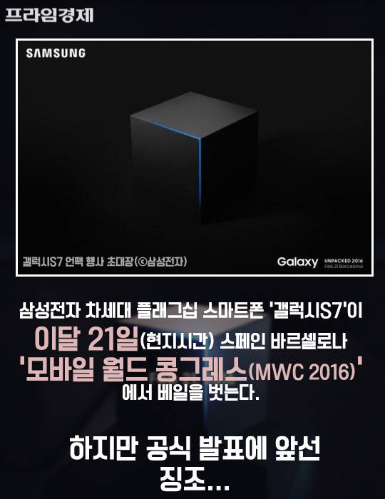 [프라임경제] 삼성전자의 차세대 플래그십 스마트폰인 '갤럭시S7'이 오는 21일(현지시간) 스페인 바르셀로나에서 진행되는 '모바일 월드 콩그레스(MWC 2016)'에서 공개된다. 삼성전자는 1일 언론과 주요 파트너사에 '삼성 갤럭시 언팩 2016' 공식 초대장을 발송했다. 행사에서는 주력 모델인 갤럭시S7과 갤럭시S7엣지가 함께 소개될 예정이다.