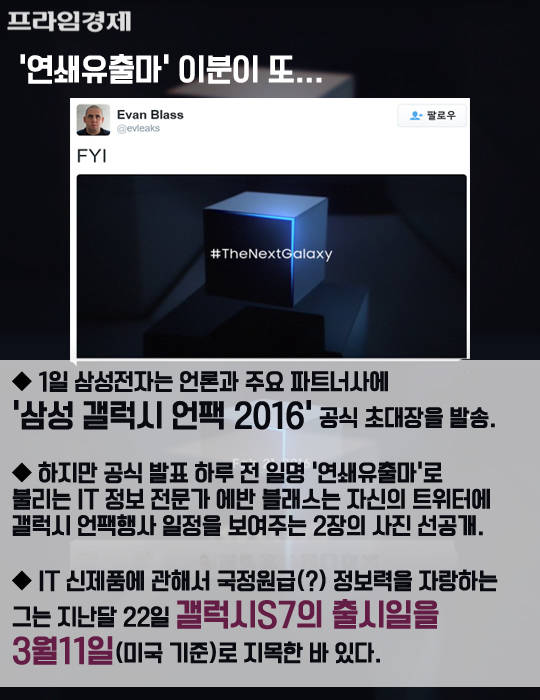 하지만 공식발표 하루 전 일명 '연쇄유출마'로 불리는 IT 정보 전문가 에반 블래스는 자신의 트위터에 갤럭시 언팩 행사 일정을 보여주는 2장의 사진을 선공개해 관심을 끌었다. IT 신제품에 관해서 상당한 정보력을 자랑하는 그는 지난달 22일 갤럭시S7의 출시일을 3월11일(미국 기준)로 지목한 바 있다.