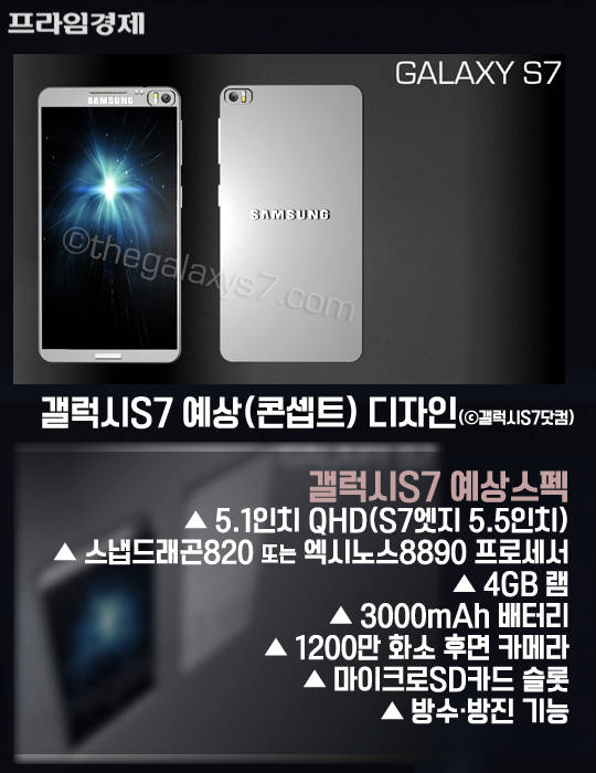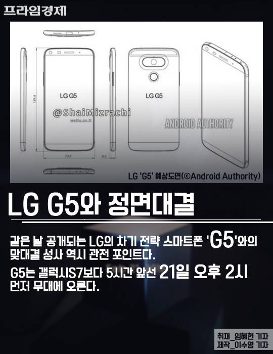 한편 같은 날 공개되는 LG의 차기 전략 스마트폰 'G5'와의 맞대결 역시 관전 포인트다. G5는 갤럭시S7보다 5시간 이른 21일 오후 2시에 공개된다. 갤럭시S7은 5.1인치 QHD(엣지는 5.5인치), 스냅드래곤820 또는 엑시노스8890 프로세서, 4GB 램, 3000mAh 배터리, 1200만 화소 후면 카메라, 방수 및 방진 기능 등을 갖춘 것으로 알려졌다.