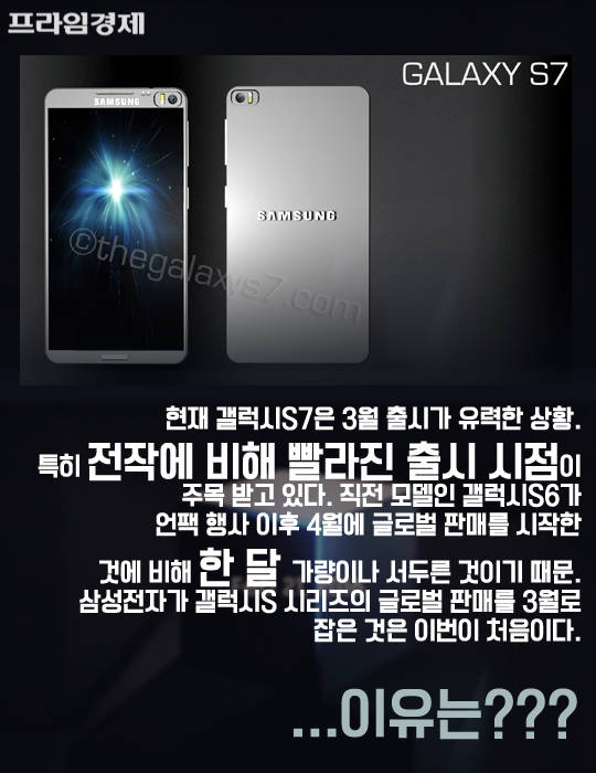 현재 갤럭시S7은 3월 출시가 유력한 상황으로 전작에 비해 빨라진 출시 시점이 주목받고 있다. 직전 모델인 갤럭시S6가 언팩 행사 이후 4월에 글로벌 판매에 들어간 것에 비해 한 달 가량 서두른 것이기 때문이다. 삼성전자가 판매정지 파문에 휘말렸던 갤럭시S3를 빼고 S 시리즈 중 가장 빨리 출시되는 것이다.