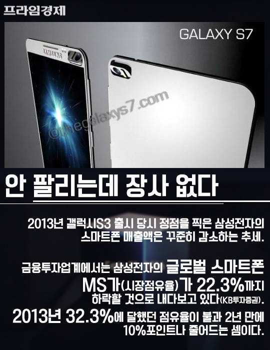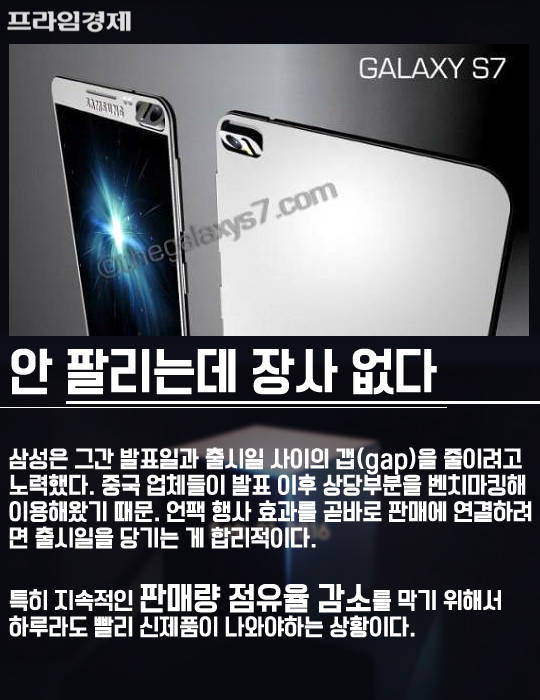 특히 지속적인 판매량 점유율 감소를 막기 위해 삼성전자로서는 하루라도 빨리 신제품이 필요하다는 점이 결정적이었다. 금융투자업계에 따르면 삼성전자의 스마트폰 매출액은 2013년 갤럭시S3 출시 때 정점을 찍은 뒤 꾸준히 감소하고 있다. 일부 증권사에서는 삼성전자의 글로벌 스마트폰 시장점유율(MS)이 20%대 초반까지 추락할 것을 우려하기도 했다. 2013년 32.3%에 달했던 점유율이 불과 2년 만에 10% 포인트나 줄어들 것이라는 얘기다.