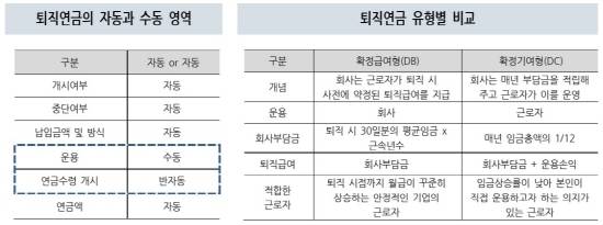 운용 주체를 정할 때는 운용 손익이나 운용 중 리스크 등을 따져봐야 하는데요. 기본적으로 운용을 회사에 맡기면 확정급여형(DB제도)이 되고, 본인이 직접 하면 확정기여형(DC제도)이 됩니다.