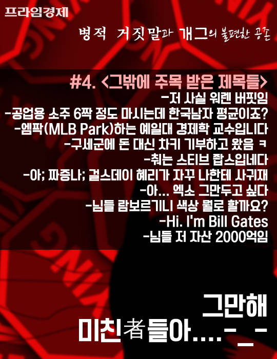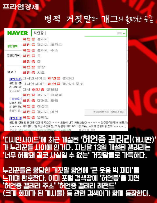 [프라임경제] 인터넷 커뮤니티 '디시인사이드'에 최근 개설된 '허언증 갤러리(게시판)'가 누리꾼 사이에서 인기다. 지난달 13일 처음 개설된 갤러리는 ‘결코’ 사실일 수 없는 황당한 거짓말들로 가득하다.
