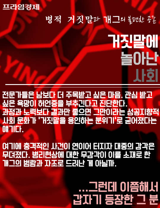 과정과 노력보다 결과만 좋으면 그만이라는 성공지향적 사회 문화가 '거짓말을 용인하는 분위기'로 굳어졌다는 얘기다. 여기에 충격적인 사건이 연이어 터지자 대중의 감각은 더욱 무뎌졌다. 병리 현상에 대한 무감각이 이를 소재로 한 개그의 범람과 자조로 드러난 게 아닐까.