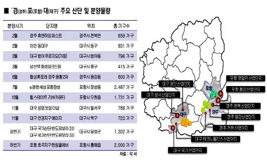 영남권 분양물량이 4만6000여가구에 육박한 가운데 전체물량의 약 4분의 1인 1만8000여가구가 '경·포·대 라인(경주-포항-대구)'에 집중됐을 정도다.