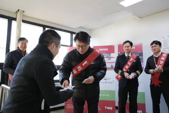 2일 티웨이항공은 정홍근 대표이사를 비롯한 임원들과 직원 30여명이 '안전 신고 포상제'에 대한 홍보 전단지를 배포하고 포스터를 부착하는 등 대대적인 홍보행사를 벌였다.