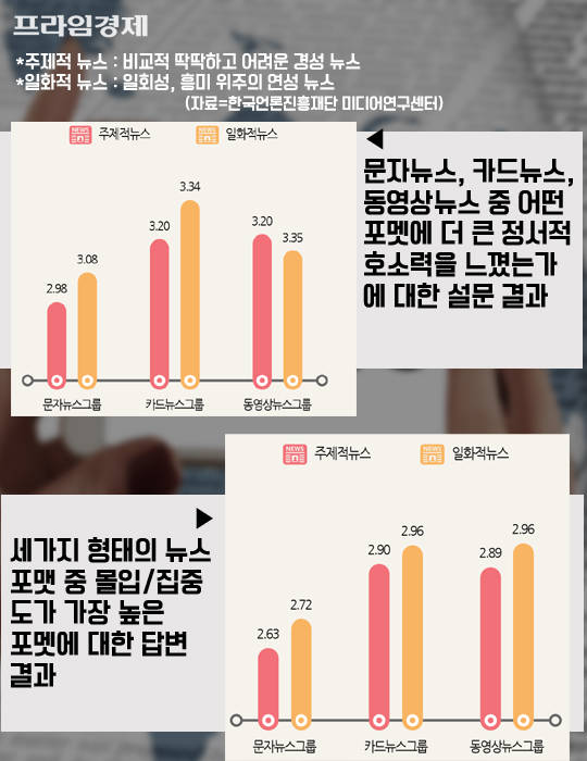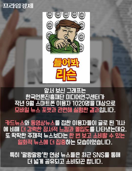 한국언론진흥재단 미디어연구센터가 지난해 9월 스마트폰 이용자 1020명을 대상으로 모바일 뉴스 포맷과 관련한 실험을 진행했다. 그 결과 카드뉴스와 동영상뉴스를 접한 이용자들이 글로 된 기사에 비해 더 강력한 정서적 느낌과 몰입도를 보였다.
