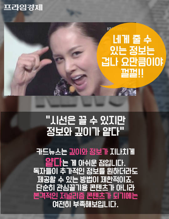 물론 카드뉴스는 깊이와 정보가 지나치게 얕다는 지적이 따른다. 독자들이 추가적인 정보를 원하더라도 제공할 수 있는 방법이 제한적이기 때문이다. 단순히 관심끌기용 콘텐츠가 아니라 본격적인 저널리즘 콘텐츠가 되기에는 여전히 부족하다는 얘기다.