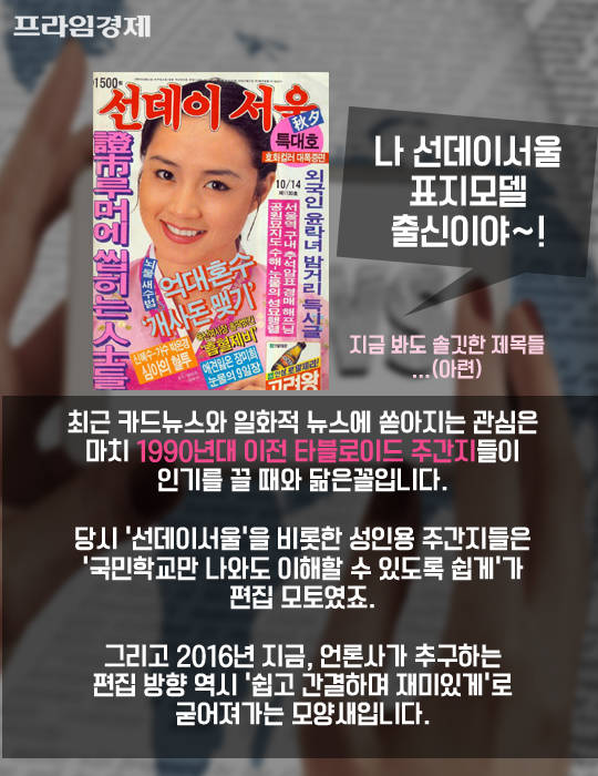최근 카드뉴스와 일화적 뉴스에 쏟아지는 관심은 마치 1990년대 이전 타블로이드 주간지들이 일기를 끌 때와 닮은 꼴이다. 당시 '선데이서울'을 비롯한 성인용 주간지들은 '국민학교(지금의 초등학교)만 나와도 이해할 수 있도록 쉽게'가 편집 모토였다.