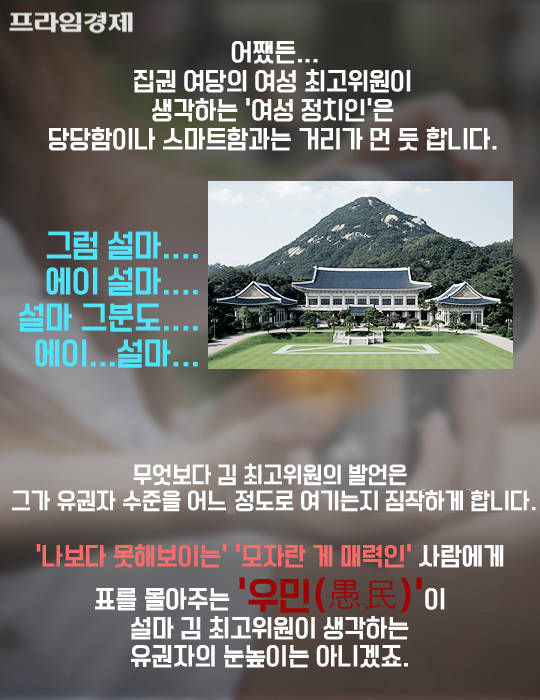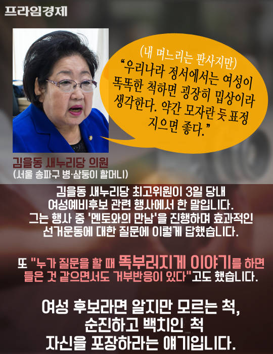 [프라임경제] 김을동 새누리당 최고위원의 발언이 '여성비하' 논란으로 번지고 있다. 김 최고위원은 3일 4·13 총선에 나서는 당내 여성 예비후보자들과 만나 "우리나라에서는 여성이 똑똑한 척 하면 밉상"이라며 "약간 모자란 표정을 짓는 게 한결 낫다"고 말했다. 한 예비후보가 선거운동 비결을 묻자 나온 대답이다.