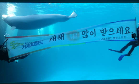 설 명절을 맞아 거제씨월드를 찾아준 고객들을 위해 흰고래 벨루가와 함께 드리는 특별한 새해 인사로, 관람객들을 위한 기념촬영 시간도 마련했다.