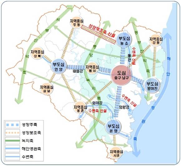 중심지 체계는 '2025년의 1도심 4부도심 7지역중심체계'를 유지하되 개발여건이 성숙된 언양부도심을 새로운 성장중심(핵)으로 육성해 동서지역 간 균형발전이 되도록 계획했다.
