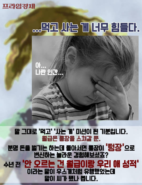 말 그대로 '먹고' '사는 게' 미션이 된 요즘입니다. 분명 돈을 벌기는 하는데 월급은 통장을 스쳐갈 뿐이고 수년 전 '안 오르는 건 월급이랑 우리 애 성적'이라는 말이 이젠 현실이 됐습니다.