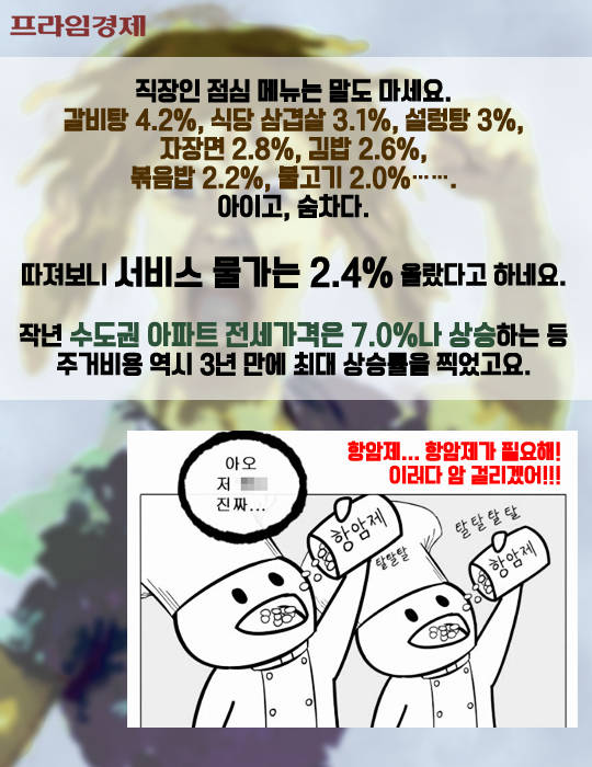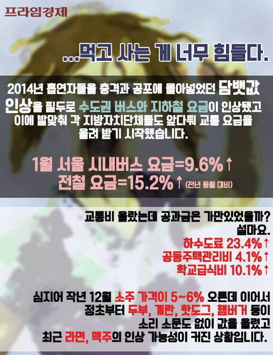 2014년 담뱃값 인상을 필두로 수도권 버스와 지하철 요금이 올랐으며 각 지방자치단체들도 앞다퉈 교통 요금을 올려 받기 시작했습니다. 교통비 올랐는데 공과금은? 하수도료 23.4%, 공동주택관리비 4.1%, 학교급식비 10.1% 상승했고 작년 12월에는 소주 가격이 5~6% 올랐습니다. 심지어 정초부터 두부, 계란, 핫도그, 햄버거 등이 소리 소문도 없이 값을 올렸는데요. 여기에 라면, 맥주 등도 곧 몸값을 올릴 것이라는 소문이 흉흉하게 돌고 있습니다.