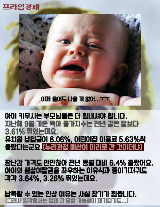 아이 키우시는 부모님들의 속도 타들어갑니다. 지난해 9월 기준으로 육아 물가지수는 전년 같은 달보다 3.61% 뛰었는데요. 유치원 납입금이 8.06%, 어린이집 이용료가 5.63% 올라 보육료 부담이 더 커졌습니다. 장난감 가격도 같은 기간 6.4%나 뛰었다고 하네요. 아이의 생살여탈권을 좌우하는 이유식과 종이기저귀도 모두 3% 넘는 상승률을 보였죠. 업체들마나 인상 요인을 설명은 하고 있는데 사실 납득하기는 어렵습니다.