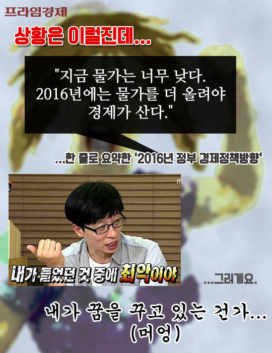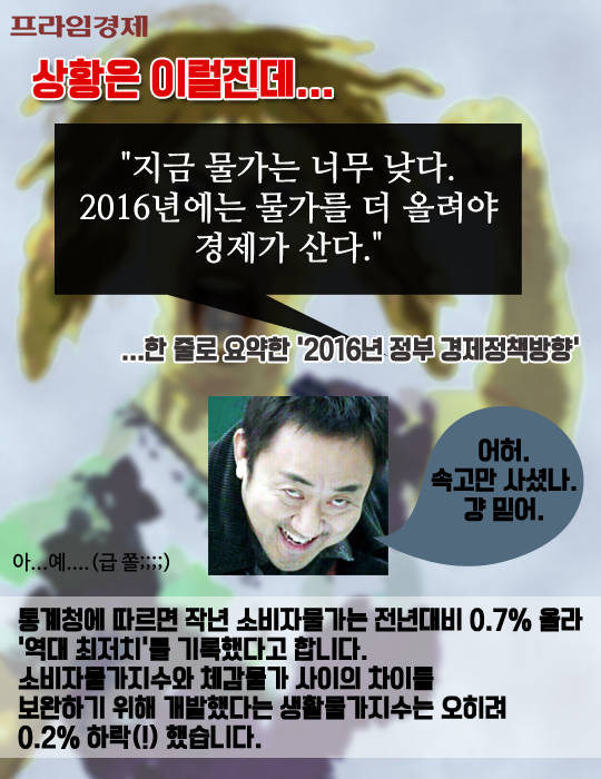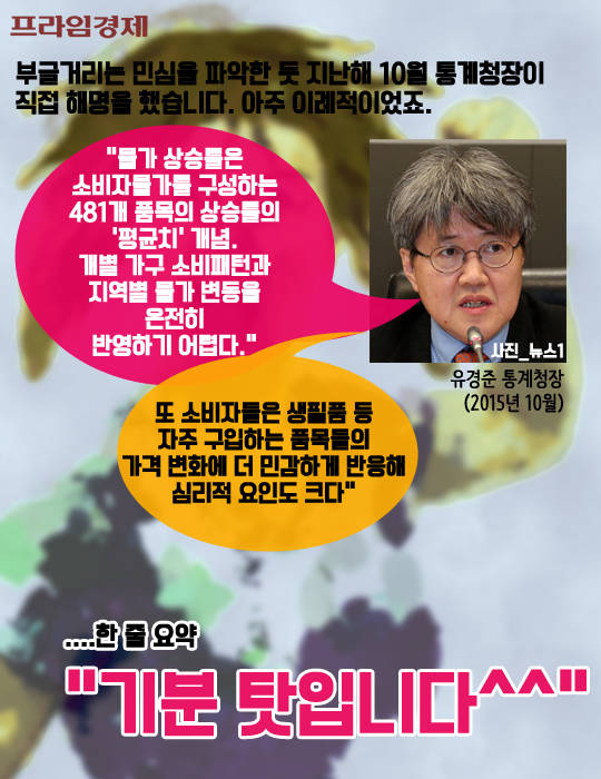 그럼에도 정부는 올해 경제정책방향을 발표하며 "현재 물가가 너무 낮다. 2016년에는 물가를 더 올려야 경제가 산다"는 논리를 폈습니다. 이에 비난이 쏟아지자 작년 10월 통계청장이 직접 해명에 나서는 일까지 벌어졌죠.