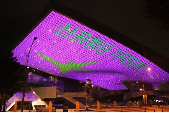[프라임경제] 부산영화의전당은 빅루프에 동남권 신공항 유치의 염원을 담은 문구와 항공기 이미지가 담긴 LED 경관조명을 선보이고 있다.
