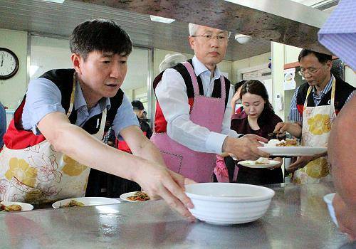 30명으로 구성된 노·사·정 연합 봉사단은 대전 중구에 위치한 '효심정'을 방문해 인근지역에 거주하는 어르신 200여명을 대상으로 무료급식을 진행했다.