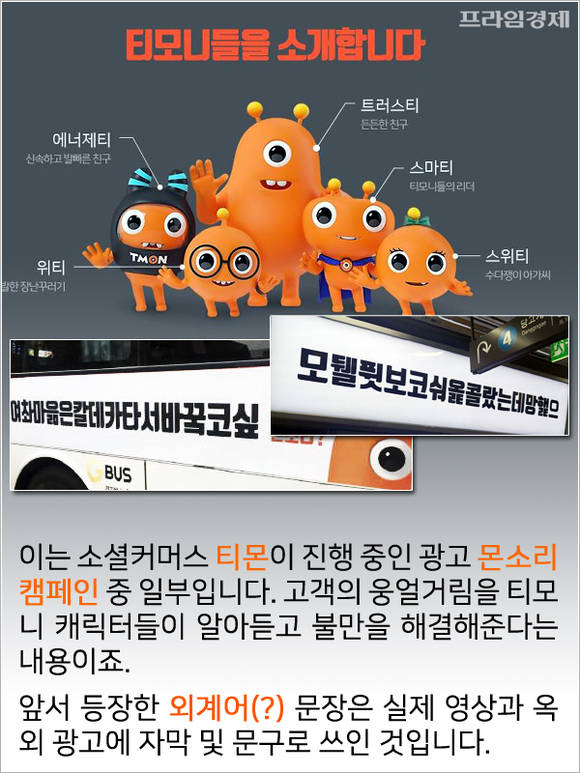 고객들이 무심코 내뱉은 웅얼거림을 티몬 캐릭터인 '티모니'들이 알아듣고 불만을 해결해준다는 무난한 내용이지만 실제 광고에 등장하는 '외계어' 문장이 어지간해서는 알아보기도 힘들 정도로 파격적이기 때문이다. 특히 전문가들 사이에서는 기업 광고가 '국어 파괴'를 부추긴다는 지적이 많다.