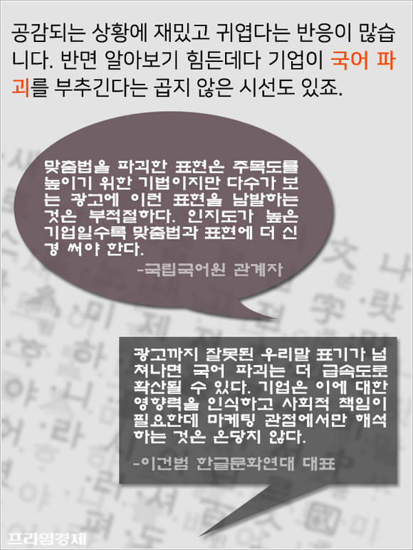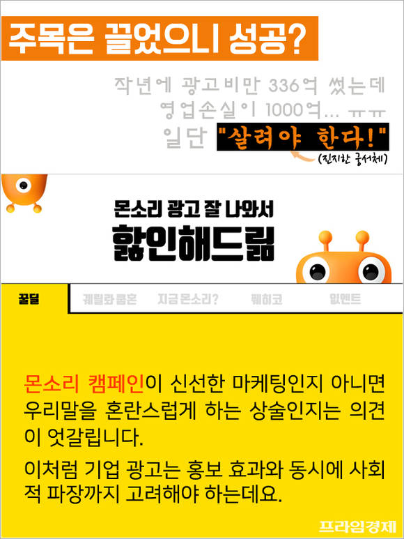 '몬소리 캠페인'을 두고 신선한 마케팅인지 아니면 우리말을 혼란스럽게 하는 상술인지는 의견이 엇갈린다. 이처럼 기업 광고는 홍보 효과와 동시에 사회적 파장까지 고려해야 한다.