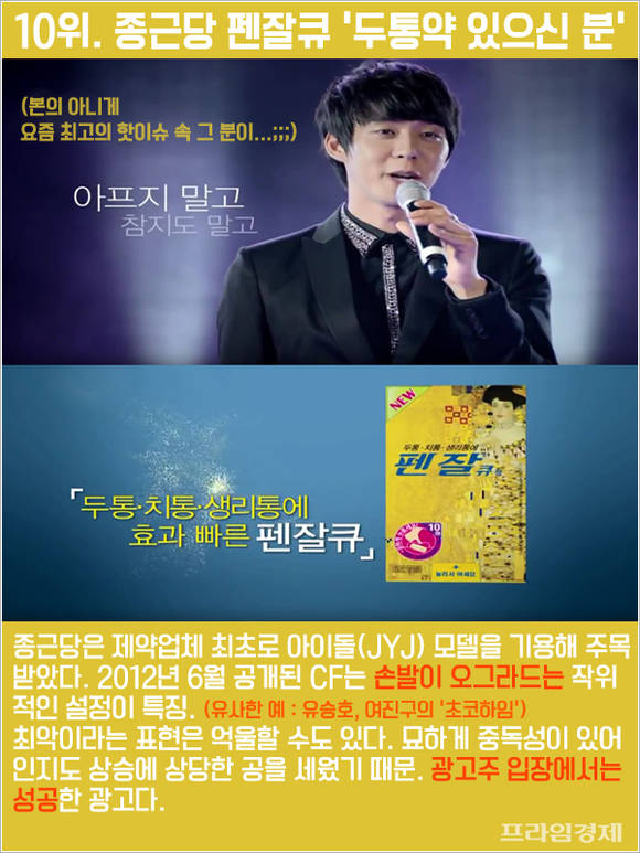 종근당은 제약업체 최초로 아이돌(JYJ) 모델을 기용해 주목받았다. 2012년 6월 공개된 CF는 '손발이 오그라드는' 작위적인 설정이 특징이다. 최악의 광고 순위에 올랐지만 묘하게 중독성이 있어 인지도 상승에 상당한 공을 세우면서 광고주 처지에서는 성공한 광고로 평가된다.