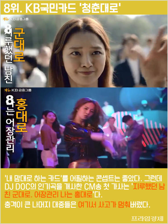 '내 맘대로 하는 카드'를 어필하는 콘셉트는 좋았다. 그런데 DJ DOC의 인기곡을 개사한 CM송 첫 가사는 '지루했던 남친 군대로. 어장관리 나는 홍대로'다. 충격이 큰 나머지 대중들은 여기서 사고가 멈춰버렸다.