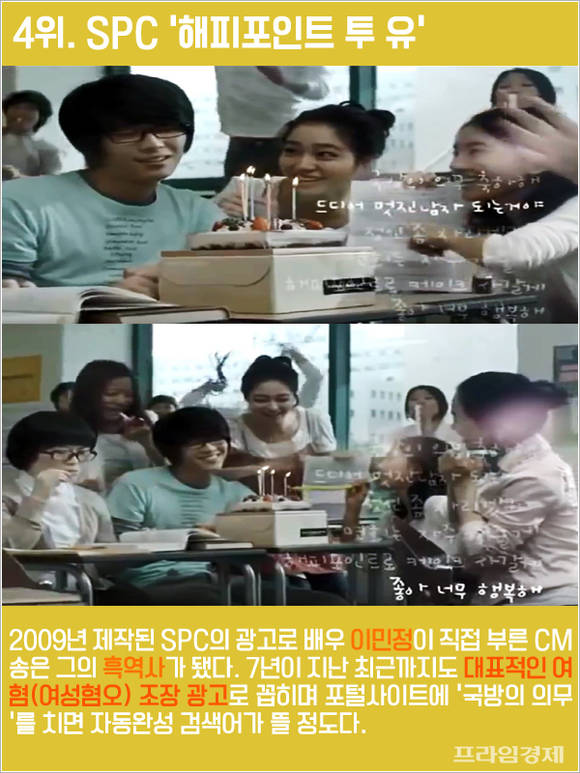 2009년 제작된 SPC의 광고로 배우 이민정이 직접 부른 CM송은 그의 흑역사가 됐다. 7년이 지난 최근까지도 대표적인 여혐(여성혐오) 조장 광고로 꼽히며 포털사이트에 '국방의 의무'를 치면 자동완성 검색어가 뜰 정도다.