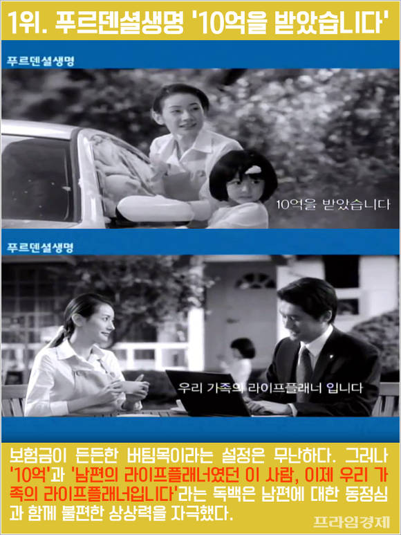 남편의 사망보험금이 남은 가족에게 든든한 목돈이 됐다는 설정은 무난하다. 그러나 '10억원'이라는 구체적인 액수와 '남편의 라이프플래너였던 이 사람, 이제 우리 가족의 라이프플래너입니다'라는 독백은 사망한 남편에 대한 동정심과 함께 불편한 상상력을 자극했다. …