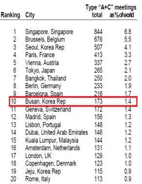 [프라임경제] 부산시는 벨기에 브뤼셀에 본부를 둔 UIA(국제협회연합) 주관의 '2015년 컨벤션도시 세계순위' 발표 결과, 세계 순위 10위·아시아 5위를 차지했다고 밝혔다.