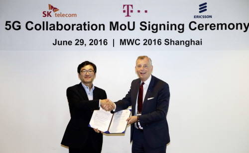 SK텔레콤은 29일 독일 이동통신업체 도이치텔레콤(DT)와 스웨덴 통신장비업체 에릭슨 등과 5G공동연구를 위한 3자협력 업무협약(MOU)를 체결했다. 이에 대해 SK텔레콤은 "향후 5G 구축을 위한 사업자 간 협력의 시발점으로 큰 의미"라고 평가했다.
