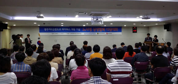 이날 다짐대회는 윤장현 시장의 축사와 함께 특수임무유공자회의 자회사인 '특임산업개발'의 공공비정규직노조, 연합노련 순환도로노조원 70여명이 공동 주관했다.