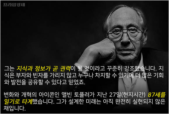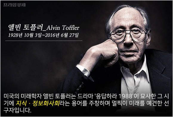 [프라임경제] '제3의 물결'로 지식정보화사회를 예견한 미래학자 앨빈 토플러가 지난달 27일(현지시간) 미국 로스엔젤레스에서 87세를 일기로 타계했습니다.
